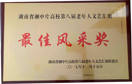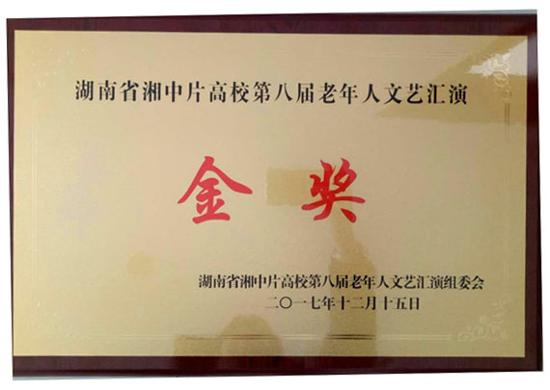 2017年12月15日,迎新年暨湖南省湘中片高校第八届老年人文艺汇演在湘潭大学举行。所辖片区的湘潭大学、湖南科技大学、湖南工业大学、湖南人文科技学院、湖南城市学院、湖南工程学院、娄底职业技术学院等7所高校,带着各自精心准备的节目,在湘潭大学华丽的舞台上,尽情演绎一场精彩的演出。我校选送的节目集体舞《爱我中华》,跳动主旋律,鼓舞众人心,荣获文艺汇演金奖。王晓玲的京剧独唱《红梅赞》,京腔京韵、独特风格,荣获最佳风采奖。