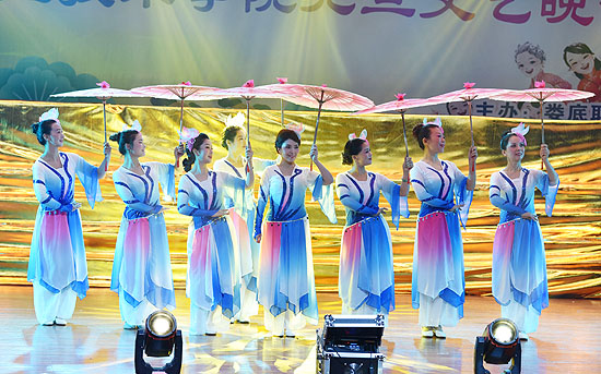 文艺晚会的十三个节目融合歌曲、舞蹈、服装秀、健美操等多种形式,各具特色,精彩纷呈。首先开场的机关分工会80人大合唱《歌唱祖国》,演唱深情饱满、气势磅礴,回顾了从1921年中共一大到2017年党的十九大胜利召开,中国共产党领导中国人民历经艰难困苦,建设富强民主新中国的光辉历程;文化传播学院分工会民族舞《吉祥》、农林工程学院分工会歌伴舞《最美的歌唱给妈妈》、护理学院分工会舞蹈《欢乐的跳吧》洋溢着浓浓的民族风情,体现了我校多民族学生友好相处,团结互助的和谐氛围;公共课部分工会健身操《健我中华》、机关分工会女声小组唱《我和我的祖国》、离退休办广场舞《爱我中华》、医药技术学院分工会广场舞《蝴蝶泉边》、语委办诗歌朗诵《新时代,我们扬帆起航》歌颂了娄职人对祖国、对时代的热爱,展示了娄职人自强不息,勇往直前的精气神;公共课部分工会三人舞蹈《月狐吟》、机关分工会古典舞《伞韵红颜》、图书馆分工会独唱《滚滚长江东逝水》歌曲余音绕梁,舞蹈秀美翩跹,陶醉了全场的观众,掌声、喝彩声此起彼伏;艺术团旗袍秀《师之韵》,平日朴实端庄的娄职园丁们在今天的舞台上一颦一笑、举手投足均充满古典韵味,将旗袍、油纸伞、红灯笼等中国元素之美体现得淋漓尽致;最后,在学保团分工会歌曲联唱《相亲相爱一家人》的嘹亮歌声里,晚会落下帷幕。校领导上台与演职人员合影,为整台晚会划上一个完美的句号。