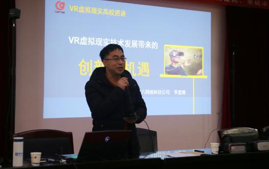 李星燎结合自己的工作历程和经验,从“什么是VR虚拟现实、VR虚拟现实的发展历程、VR虚拟现实的应用、虚拟现实的未来前景、新技术的创新和机遇”这五个方面深入浅出的讲解了VR的现状和未来的发展,并就VR目前的人才需求与职院的动漫专业人才培养思路进行了探讨。讲座后,李总与同学们进行了现场交流,同学们并参与了现场VR体验。