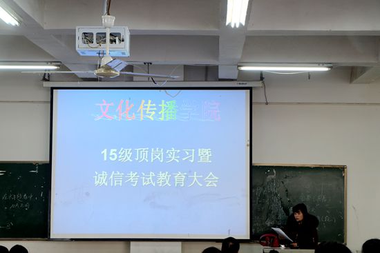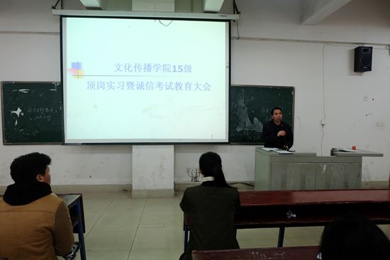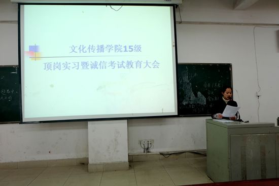 1月11日、12日中午12点,文化传播学院15级文秘专业和应用英语、商务英语专业的学生分别在主教学楼110举行顶岗实习暨诚信考试教育。学工副院长贺建良、辅导员和18届所有毕业生参加。