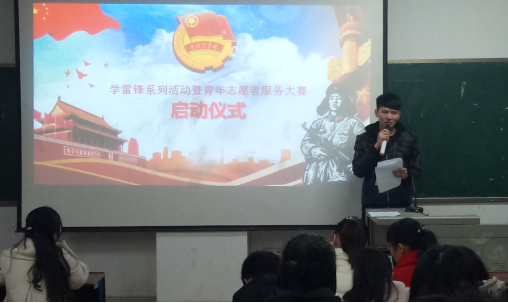 3月8日下午18:00,娄底职业技术学院校团委学社联在主教楼210教室召开2018年“学雷锋动员大会暨青年志愿者服务项目大赛”启动仪式。本次会议由团委学生副书记王子豪主持,出席本次会议仪式的有团委副书记游骏、团委指导老师李明、杨倩赟以及各二级学院团副、校团委学社联全体干部。