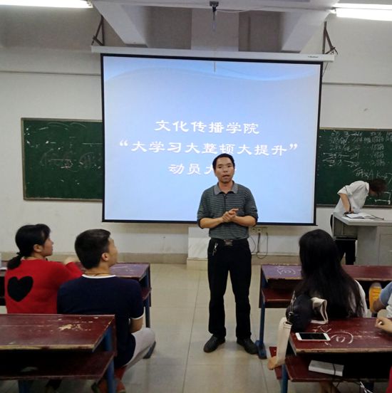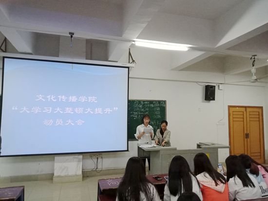 4月1日晚,文化传播学院在主教楼410教室举行了16级同学“大学习大整顿大提升”动员大会。参加此次会议的有学工副院长贺建良,辅导员柯莎,刘容梅及16级全体学生,大会由学生会主席孙梅焱主持。