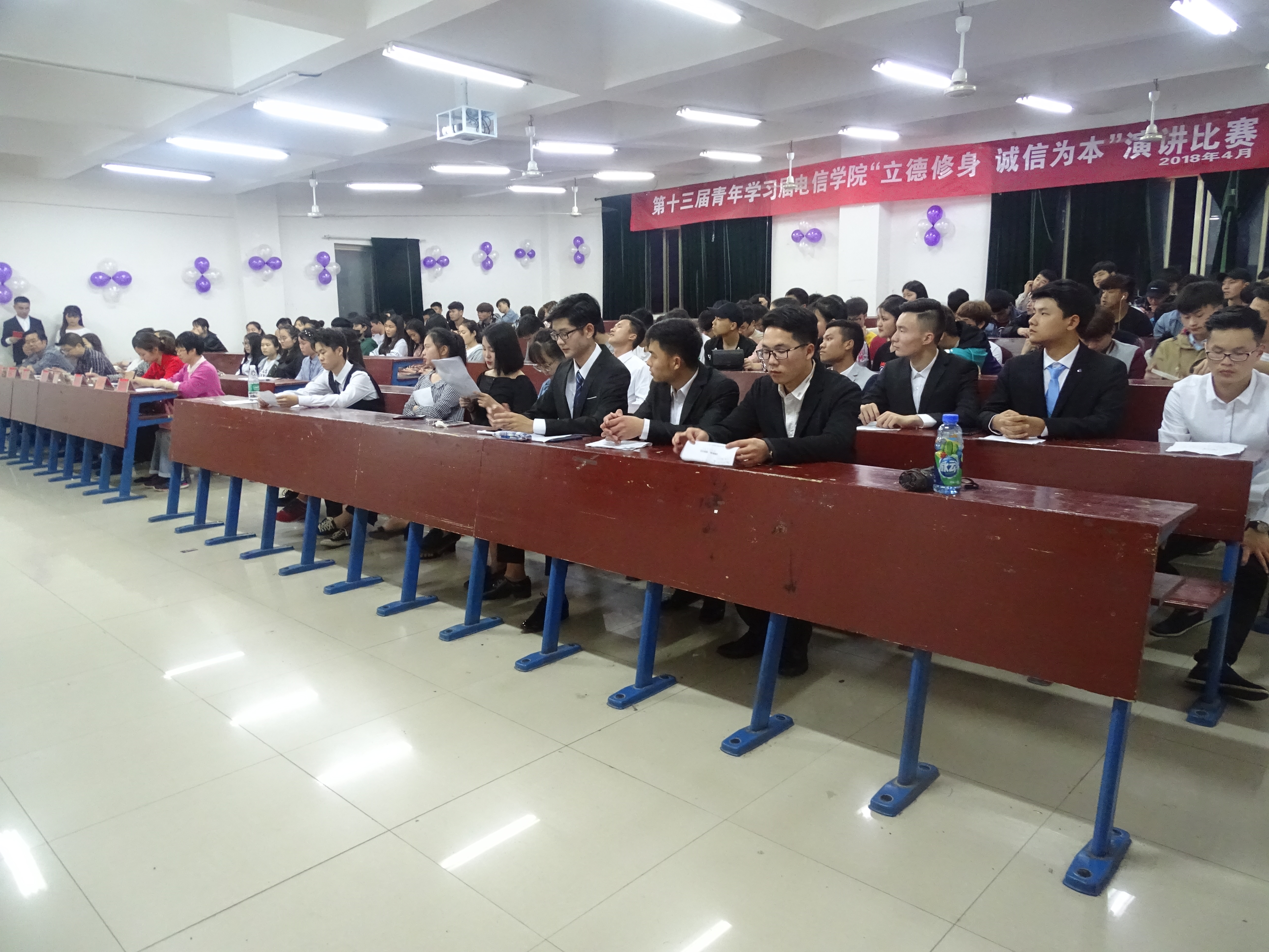 4月12日晚,电子信息工程学院在主教楼510举行第十三届青年学习节“立德修身,诚信为本”演讲比赛。学校党委副书记王健龙,电信学院院长刘罗仁,副院长晏然,团总支书记张雯宇,学工干事周永坚及全体辅导员出席并担任评委,电信学院部分班级参加此次比赛。此次比赛以“立德修身,诚信为本”为主题,采用十分制、自主命题演讲的形式进行,共有14位选手参赛。