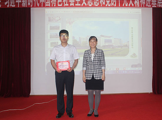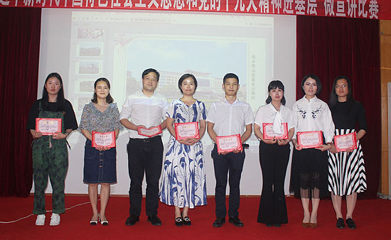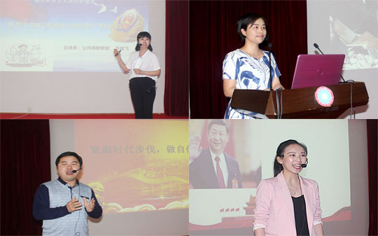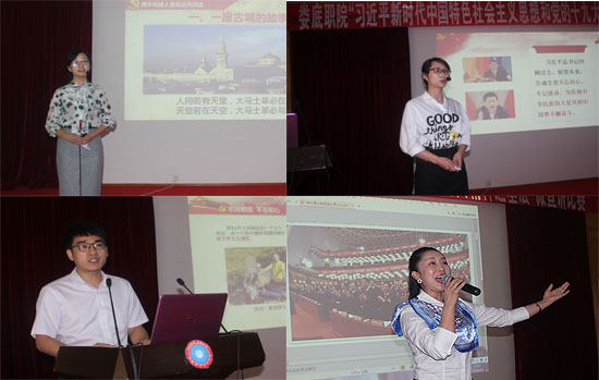李文莲、督导团团长吴连贵、团委书记刘媛、思政课部主任周旺东、组织部副部长曾曙华、宣传部副部长张波、教务处副处长李宇才、思政课部副主任贺山青担任评委。经过全校各党总支初赛、复赛选拔出的15名选手参加决赛角逐。比赛中,选手们结合ppt,声情并茂,以小见大,结合从我校实际,深入浅出地介绍了自己对习近平新时代中国特色社会主义思想和党的十九大精神的理解,抒发了对新时代、对中国共产党、对中国特色社会主义的真挚感情,也为在场听众贡献了一场精彩的政治理论视听盛宴。