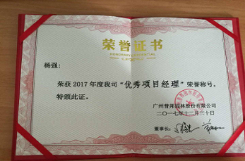 杨强担任绿化主管,先后主理了嘉裕第六州湿地公园项目、保利城三期(小区)项目、保利狮子湖香樟郡(小区)项目,2014年2015年连续两年获得公司“优秀施工员”荣誉。2016年开始,杨强被提升担任保利西子城售楼部(展示区)项目现场负责人,半年后,他被再次提拔,走上了“项目经理”之路,先后管理了滨河绿化带B标段景观工程、蓝光雍锦世家售楼部、龙湖听蓝湾售楼部等项目,每个项目造价都是数百万。在主理蓝光地产项目时,杨强全身心扑在项目上,带领团队从项目规划到施工、管理、交付,每一步都精益求精,将项目的经济效益和社会影响做到了极致,也因此获得了甲方蓝光地产5万元奖励。在像杨强这样的员工们的努力下,普邦园林股份有限公司拿到了广东省优秀园林企业、广东省诚信示范企业等多个荣誉称号,2016年公司的项目还获得了中国土木工程詹天佑奖优秀住宅小区金奖。2017年,杨强被评为公司“优秀项目经理”。