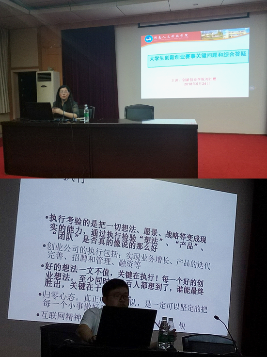 为贯彻落实《国务院办公厅关于深化高等学校创新创业教育改革的实施意见》推动我校创新创业大赛的深入开展,提高大赛项目指导老师的能力与水平,以及参赛项目的质量和竞争力。5月21-5月24日,校团委邀请了人文科技学院的付盾、谢丽、李宁、刘燃红老师分别在主教楼211报告厅为娄职学子作“大学生创新创业大赛”系列专题辅导讲座。各二级学院师生代表参加了辅导讲座。