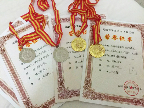 “广播操、健美操、健身操、毽球、篮球、排球、登山各项运动我都喜爱,参加过不少比赛也获过奖。青春就是要奋斗才美丽!”2008年、2012年,胡贞渝代表学校参加全省大众体育运动会广播体操比赛,分别获得二等奖和一等奖;2013年,她参加湖南省第四届全民健身节全民健身操比赛,获得一等奖;2014年她代表学校参加湖南省第八届少数民族体育运动会民族健美操比赛,获得银奖;2015年参加湖南省机构编制系统干部职工广播操比赛,获得一等奖;2017年参加湖南省健康趣味运动会获得团体二等奖。
