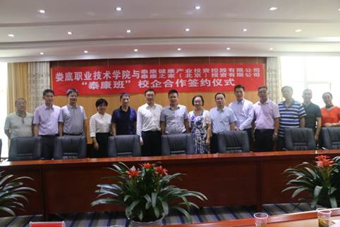 8月27日,娄底职业技术学院与泰康健康投资控股有限公司、泰康之家(北京)投资有限公司在医学院校区中会议室签约校企合作共建“泰康班”,娄底职院副院长周志和、党委委员梁凌洁、院长助理朱艳平、教学督导兼医学教学部主任曾卓、招生就业处处长戴志鹏、护理学院全体班子成员,与泰康健康投资控股有限公司养康事业群副总经理张铭、公司养康事业群人力资源部泰康班负责人许岩、公司长沙湘园社区总经理谢杰共同出席了签约仪式,双方就校企合作共建“泰康班”的美好远景进行了愉快友好地会谈。