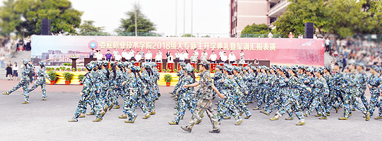党委书记李文莲朗声宣布:新生军训分列式表演开始!我校4500名2018级新生踏着铿锵有力的步伐,一个个精神饱满、整齐地列队从主席台走过,展现出了飒飒英姿和青春朝气。