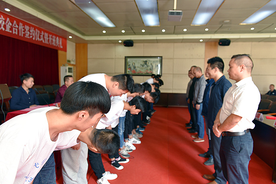 15名试点班学生高声宣誓“我们一定向师傅学习,勤学苦练”,给企业导师们深深鞠躬,致敬师礼。