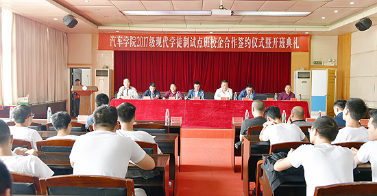 娄底湘诚汽车销售服务有限公司总经理李宏丰、娄底市三湘进口汽车维修中心总经理曾志兵、娄底市五洲通程汽车服务有限公司总经理颜学良、娄底捷路驰专修服务有限公司经理曾长河、娄底九号车工场汽车维修服务有限公司经理吴长飞及五家企业的技工师傅周兴旺等,我校副校长周志和、教务处副处长李宇才、汽车学院院长易爱良、副院长左卫民、苏志华、聂进、汽车学院相关任课教师代表,现代学徒制班学生(学徒)参加了大会。