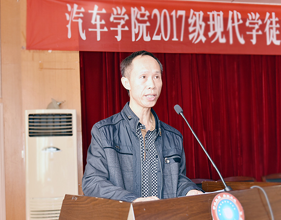 典礼由易爱良主持。他首先讲话,讲述了汽车学院寻找合作企业,进行现代学徒制试点工作的历程。他指出,娄底湘诚汽车销售服务有限公司等五家企业生产规模较大、设施齐全、技术力量强、经营管理规范、效益好,双方就试点工作目标、人才培养方案、“4+2”教学工作学习模式、师徒互选、学生(学徒)工作学习内容、实习补贴、实习保险、实习纪律、安全纪律等方面达成了一致意向。2017级试点专业有近50名同学报名,经过数轮筛选,最后确定了15位能吃苦耐劳、有强烈工匠情怀的同学进入首批试点班。易爱良希望同学们勤奋修为,练就一身匠技;追求卓越,修得一颗匠心;珍惜机会,成就一番匠绩。