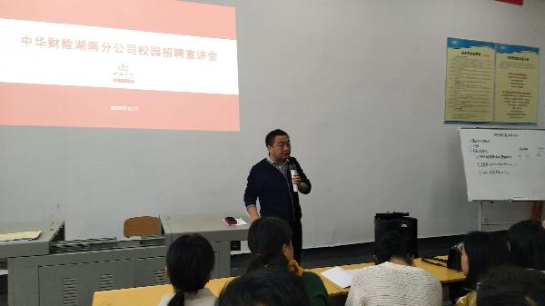 11月5日上午,中华联合财产保险公司在汽车学院对该院2019届毕业生开展专场招聘会。此次会议邀请到中华财险湖南分公司人事资源管理科的马科长为学生进行公司宣讲。汽车学院出席本次招聘会有党总支书记胡治民,副院长苏志华以及各教科主任,汽车学院16级毕业生参加了此次专场招聘会。