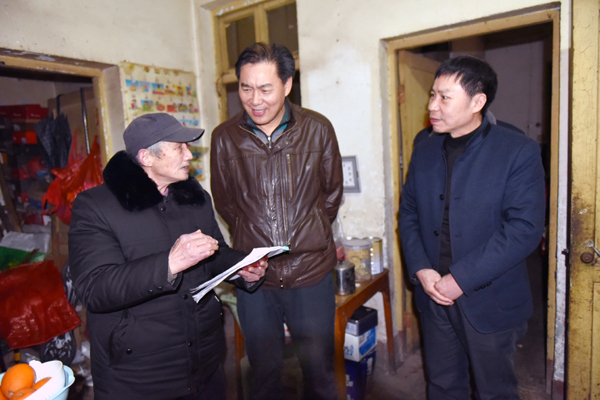 朱忠义一行首先来到王庭义家。朱忠义亲切询问王庭义:“多大年纪了?”当得知王老年近九十,身体特别好,领导们竖起了大拇指。朱忠义代表学校送上了慰问金,祝福王老全家幸福,小年愉快。