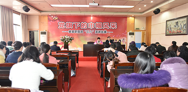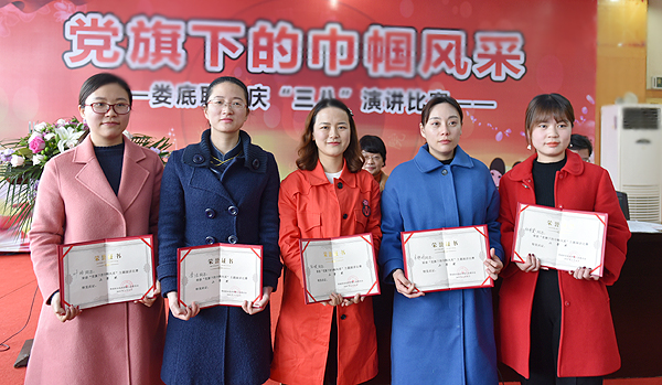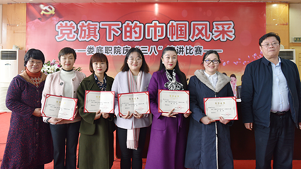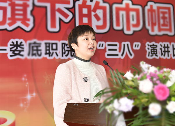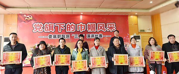 3月8日上午,娄底职院举办庆“三八”演讲比赛,女教工代表们在主教学楼报告厅欢聚一堂,以精彩的演讲展示“党旗下的巾帼风采”,以积极昂扬的姿态度过了一个难忘的妇女节。大会还表彰了2018年学校工会工作中表现突出的先进集体和先进个人。