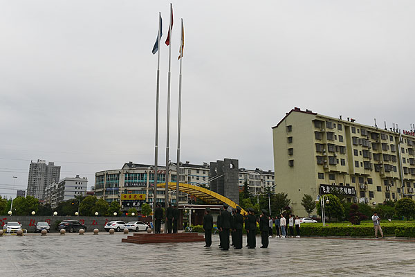 仪式第一项为升旗仪式,国旗班队员护送国旗来到升旗台,随着庄严的国歌声响起,五星红旗徐徐升起,全体师生面向国旗,庄重而严肃地行注目礼。