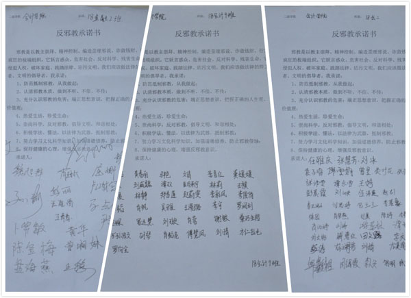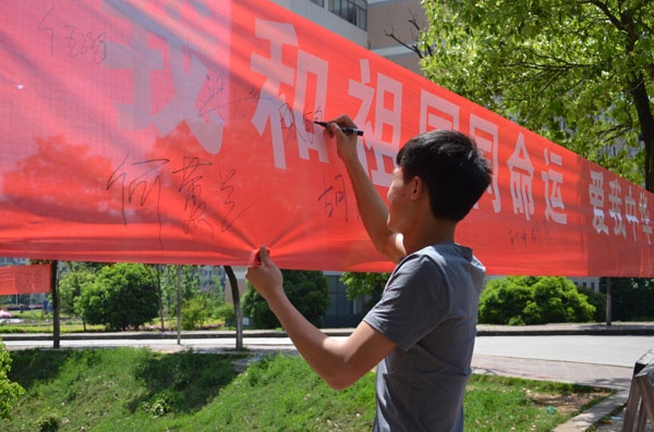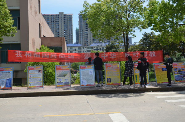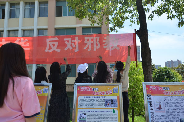 在国家安全主题教育活动月期间,我校在知行路举行国家安全主题教育活动月签名及展板宣传活动。在校学生们纷纷响应,在写着“爱我中华,反对邪教”的横幅上签名,在反邪教承诺书上签名,并观看“防范抵御邪教,创建文明娄底”宣传展板,大家表示,将自觉抵制和防范邪教以及类邪教组织的传播和渗透活动,维护稳定和谐的校园环境。(蒋田田 李倩艳 丁香 张子悦)