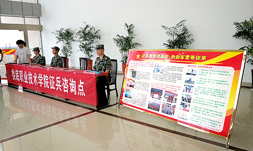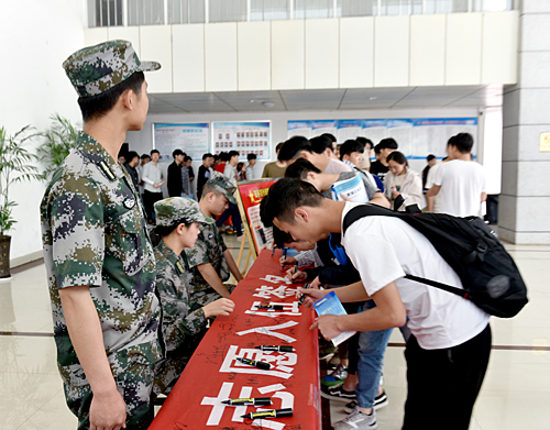 征兵启动仪式后,辅导员和学生代表们前往大厅参与政策解答会及签名仪式。(李莉 谢方 覃凡 龙婷)