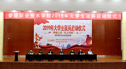 4月24日,我校2019年大学生征兵启动仪式在新培训楼学术报告厅举行,此次活动由娄底市人民政府征兵办公室和我校主办。娄底军分区副司令员周仁友、动员处处长胡长涛,我校党委副书记王健龙、党委委员、副校长周志和、宣传统战部部长王宗凡、学生工作处处长李规、武装部副部长伍琳在主席台就坐,娄底军分区动员处相关同志、我校各二级学院党总支书记、学工副院长、辅导员及学生代表参加。仪式由周志和主持。
