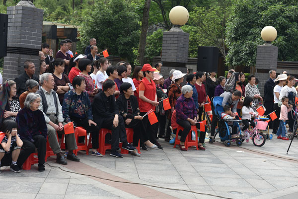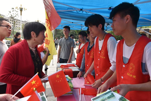 随着悠扬的乐声响起,我校文艺演出队伍带来了《歌唱祖国》《共筑中国梦》等文艺表演,北门广场顿时融汇成了歌舞的海洋,前来围观的群众挥舞着小国旗,有的拿出手机记录这精彩一刻,有的和着演员们的表演齐声欢唱。
