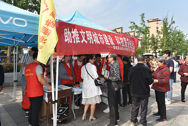 广场两侧,我校附属二医院副院长林迎辉带领医生们给居民们现场诊疗,解答咨询,免费发放常用药品。电子信息工程学院IT电子文明实践队的志愿者们为居民开展科普咨询,上门义务修理家电,每个展台前等候的人群都排成了道道长龙。很多从家中赶来的老人高兴地说:活动办得很好,把公益和服务送到了家门口,把方便和满意带到了身边,让我们体会到了实实在在的幸福感和自豪感。