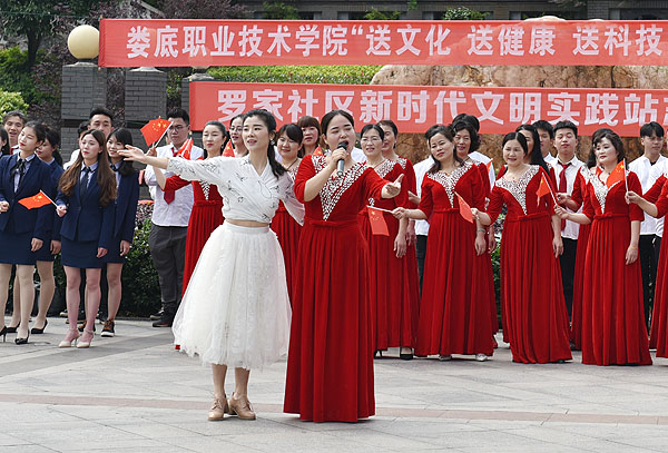 这是娄底职院献歌祖国的系列活动之一。作为地方高职院校,娄底职院自觉承担起服务地方、传播文明的责任。近日,娄底职院先后在涟源市建新村和娄星区罗家社区开展“送文化、送健康、送科技、送服务”(简称“四送”)活动,巩固脱贫攻坚成果,助力文明城市建设。