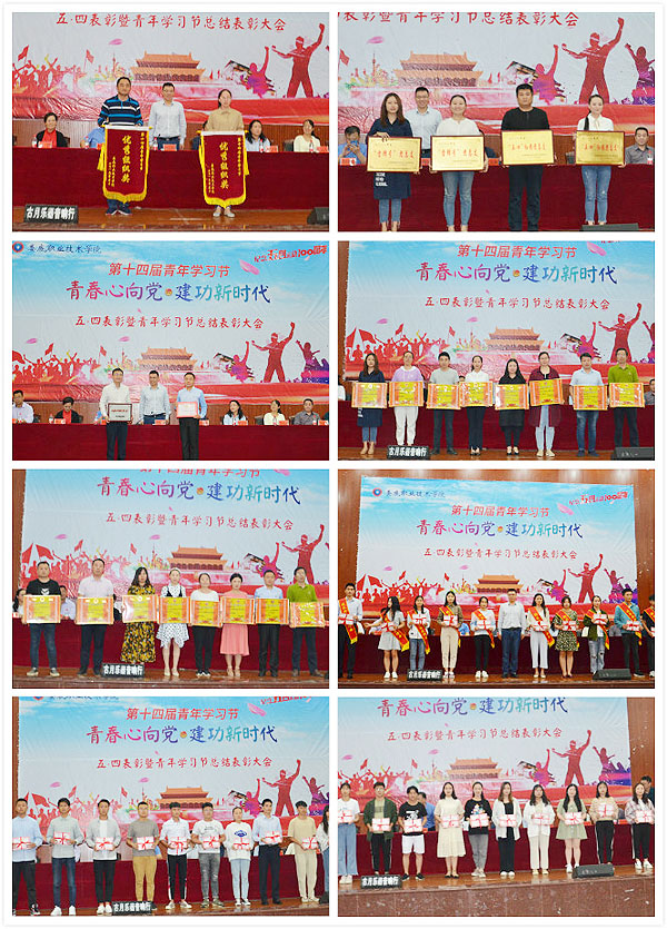 李规、刘媛宣读了各项表彰决定。大会对第十四届青年学习节各项活动的各获奖选手和优秀组织单位;2017-2018学年度“三好学生”、“优秀干部”、“校长奖学金”、“优秀班级”和2018年度“五四红旗团总支”、“五四红旗团支部”、“优秀团员”、“优秀团干”、“雷锋号团总支”、“雷锋号团支部”、“雷锋个人”进行了表彰。文化传播学院、艺术设计学院获得青年学习节优秀组织单位奖,机电工程学院、土木工程学院获得“雷锋号”团总支荣誉称号,会计学院、医药技术学院获得学校“五四红旗团总支”荣誉称号,护理学院获得娄底市“五四红旗团总支”荣誉称号,电信学院获湖南省“五四红旗团总支”荣誉称号。