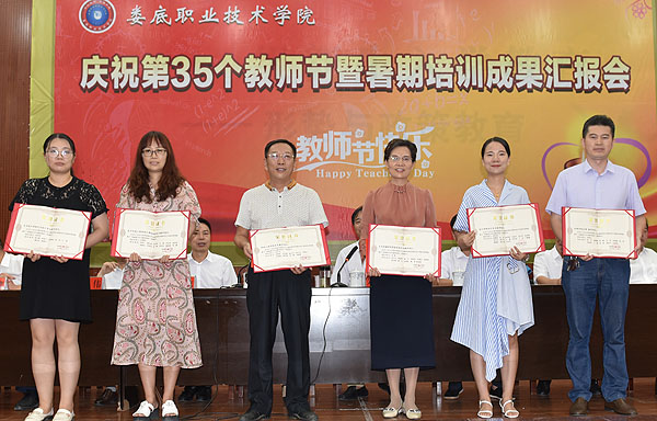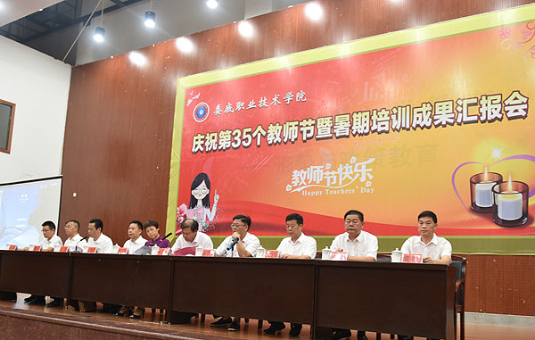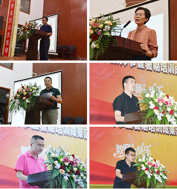 在第二阶段由副校长颜彩飞主持教师暑期培训成果汇报会。学校黄大年式教学团队教师代表、农林工程学院农学教师团队负责人禹华芳,2019年湖南省职业院校教师职业能力比赛获奖选手代表、机电工程学院龙育才,暑期思政课专兼职教师延安培训班教师代表、思政课部主任周旺东,文化传播学院院长刘燕,暑期骨干教师教学能力(国家教育行政学院)培训班教师代表、汽车学院副院长聂进,暑期杭州职院培训班教师代表、医药技术学院教师彭俊亮,二级学院暑期培训教师代表、机电工程学院教师李权分别在会上发言。(文/刘艳 图/刘艳 李莉)