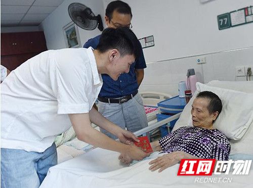 在康复医院,游骏率领青年志愿者们慰问了罗盛教烈士的妹妹罗亮香老人。康复医院老年医疗呵护中心大科主任兼A区主任廖秋莲介绍说,罗亮香老人2017年入院,下肢瘫痪但头脑清醒,是医院的一级护理老人。罗亮香老人拉着志愿者、一只腿高位截肢的娄底职院2019级电子商务班同学韩力的手,给大家讲起了自己家的故事。