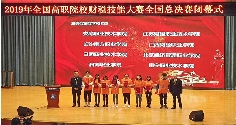 11月2日,2019年全国高职院校财税技能大赛全国总决赛在北京电子科技职业学院举行。本次大赛由中国注册税务师协会主办,中国高等教育学会高等财经教育分会、中联集团教育科技有限公司、中联税务师事务所有限公司协办。赛项分为区域赛和决赛两个层次,共有213所高职院校、1500名师生参与,最终52所高职院校进入全国总决赛。经过激烈的角逐,我校会计学院陈云梅、刘双平老师指导的姚婕、吕美玲、杨贺颖学生团队荣获三等奖。