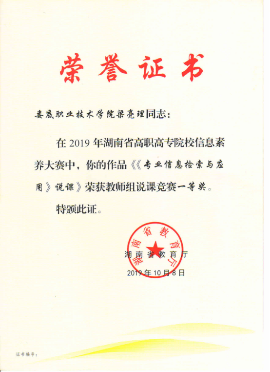 2019年6月,我校图书馆组织馆员和学生参加了湖南省教育厅主办的高职院校信息素养大赛,师生们均取得优异成绩,其中梁亮理老师的《专业信息检索与应用》获得教师组说课一等奖、张理科副馆长执笔的《信息素养基本知识与移动图书馆的使用》获得案例组三等奖、张理科副馆长指导的电信学院18软大三班薛恒同学获得学生组优秀奖。