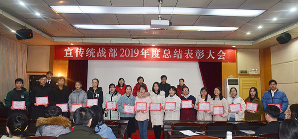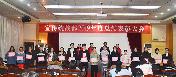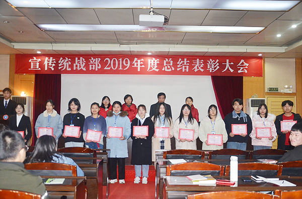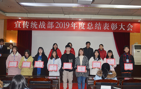 在总结表彰环节,学生记者站原站长谢方、广播站原站长龙刚毅分别总结了校报和广播站过去一年的工作:在宣传统战部老师的带领与全体成员的努力下,校报和广播站坚持正确的舆论导向,高雅的审美情趣,尽心尽力为学校的宣传工作贡献了自己的力量,记者采访水平、播音员的播音质量等都上了新的台阶。学生记者站新任站长屈洁、广播站新任站长彭丽媛宣读了校报和广播站新任学生团队负责人、新成员名单;刘艳、李莉老师宣读了2019年度表现突出的优秀学生名单。宣传统战部老师为获奖同学颁奖并合影。