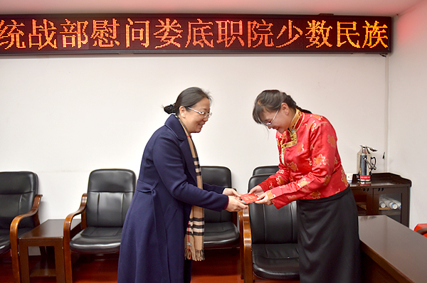 陈健庄代表娄底市委统战部为少数民族学生代表送上了慰问金,表达了对我校师生的新年问候和祝福。陈健庄高度肯定了我校少数民族学生教育管理工作,希望我校要进一步加强民族团结进步工作的建设,在既有成绩上继续发挥优势,依托各类资源做好少数民族学生的教育培养工作。同时,她也勉励少数民族学生要牢记党和政府的关心和厚爱,珍惜机会、积极进取、勤奋学习,努力把自己培养造就成为对国家、对社会的有用之才,把自己塑造成为符合新时代要求的高素质技能型人才。(李莉)