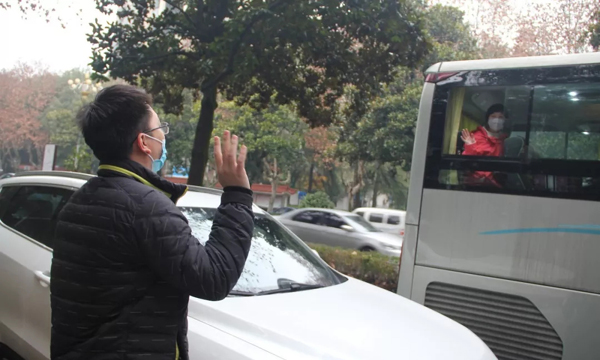 “老婆,你在前线一定要做好防护,照顾好自己,加油!”医院骨科主治医师彭阳为妻子曾丽娟送行,挥手告别。