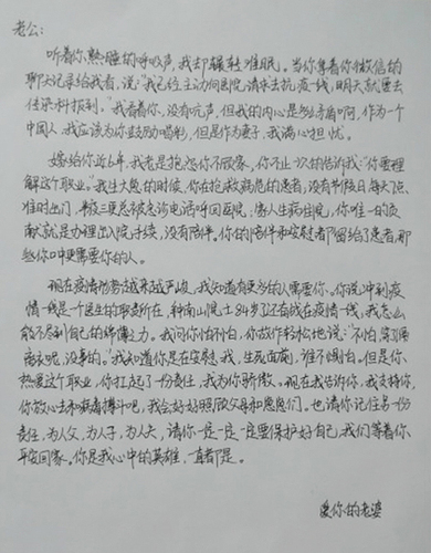 本网讯 英雄们安心在前线冲锋陷阵,离不开后方的坚定支持。娄底职业技术学院陈曼老师的丈夫龙晓丹是娄底市中心医院53病室(泌尿外科)主治医师,在他进入感染科隔离病房工作的第三天,微信上收到一封陈曼手写的“与夫书”。“你扛起了一份责任,我为你骄傲……你放心去和病毒搏斗吧,我会好好照顾父母和崽崽们。……请你一定一定一定要保护好自己,我们等着你平安回家。……”这封家书被腾讯网、新湖南、华声在线、潇湘晨报、娄底新闻网等多家媒体报道,人们纷纷点赞。