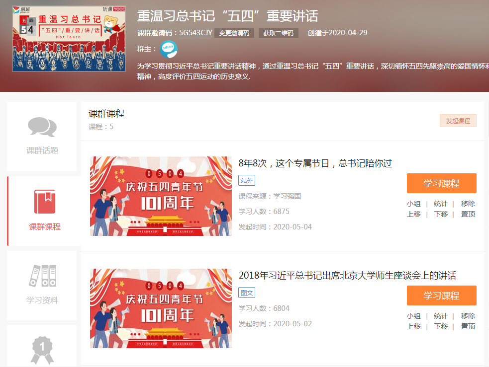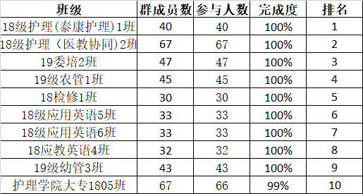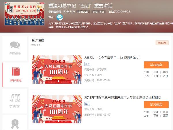 活动通过易班优课创建重温习总书记“五四”重要讲话课群,上传《8年8次,这个专属节日总书记陪你过》、《2018年习总书记出息北京大学师生座谈会上的讲话》、《学习贯彻习总书记五四重要讲话精神》、《2019年纪念五四运动100周年习总书记发表重要讲话》、《习总书记强调 加强对五四运动和五四精神的研究》5个学习课程及《重温习近平总书记“五四”重要讲话》PPT学习资料进行学习重温。活动开展后,各学院广泛宣传组织,同学们积极参与学习,参与人数达7000余人,课群学习活跃度达21443,课群话题达6538条。活动时间于5月10日结束。根据各学院课程学习完成度,护理学院、文化传播学院、医药技术学院获得本次重温习总书记“五四”重要讲话课程网络学习先进学院,18级护理(泰康护理)1班等十个班级获得先进班级。