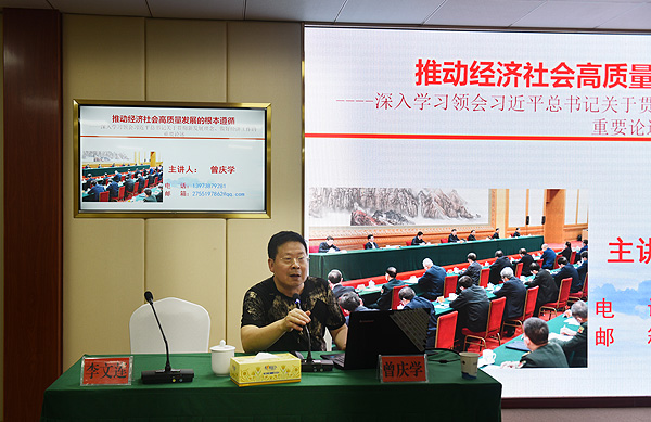 原市委讲师团副主任曾庆学教授就“推动经济社会高质量发展的根本遵循——深入学习领会习近平总书记关于贯彻新发展理念、做好经济工作的重要论述 ”这一主题作讲座。他从深入学习领会中央经济工作会议和省委经济工作会议精神,深刻领会和把握习近平总书记在有关会议上的重要讲话精神,以习近平总书记重要论述为指导,努力实现经济社会高质量发展三个方面系统开展了论述。