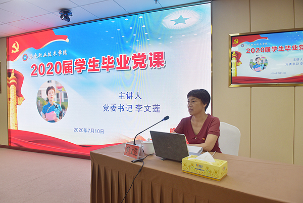 7月10日上午,校党委书记李文莲为2020届毕业生党员所讲的毕业党课在综合楼视频会议室举行,并由钉钉网络在线方式向全体2020届毕业生党员、辅导员及思政课教师直播。在这个因疫情影响而没有在校园告别的毕业季,李文莲用温言细语告慰着这一年来被疫情所干扰的毕业生们,用豪迈情怀鼓舞着即将起航的娄职学子。副校长周志和,相关部门主要负责人,各二级学院党总支书记、学工副院长,2020届毕业生党员代表参会。党课由周志和主持。