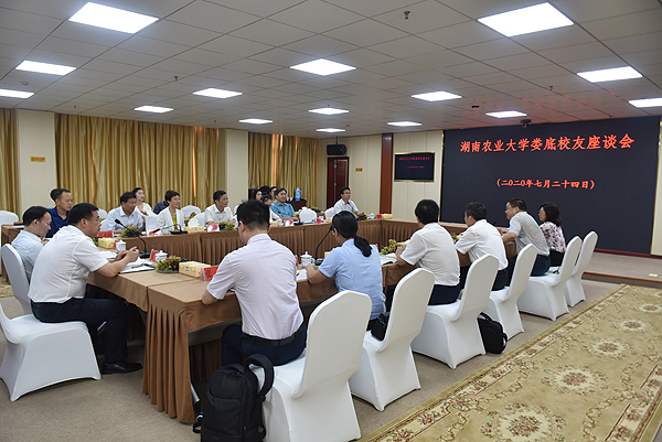 7月24日,湖南农大娄底校友座谈会在我校综合楼视频会议室举行,以湖南农业大学原校长符少辉带队的湖南农大校友总会领导组一行与娄底的校友们共聚一堂,畅所欲言。会议由农大校友、市政协副主席、民盟娄底市委主委邵瑛主持。