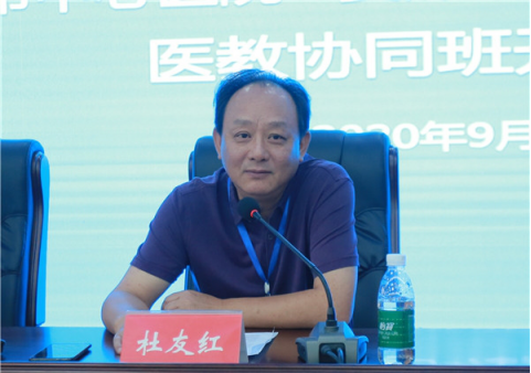 会议由娄底市中心医院护理教研室副主任孙玉红主持,护理学院院长范国正首先做了会议发言,他对市中心医院教学工作表示充分肯定并给予感谢,同时要求同学们要珍惜在医院的学习机会,端正学习态度,改进学习方法,注重培养自主学习的能力,多去科室实践,主动大胆提问,更好地将理论知识与实践相结合,学习医院医护人员的无私奉献精神。随后2019级医教协同班学生代表汤若璇发言,表达了同学们到娄底市中心医院学习的决心与信心以及对医院师资团队的信任。随后,娄底市中心医院党委委员、副院长杜友红在致辞中代表医院全体干部职工对新学员的到来表示热烈欢迎并表达了良好祝愿。杜院长介绍了娄底市中心医院的基本概况及教学工作情况,同时对全体同学及带教老师提出了三点要求:一是所有同学要做到严肃学风学纪,确保学有所得;二是所有同学要做到理论联系实际,确保学有所用;三是所有兼职老师要做到因材施教,确保教学相长。最后,杜院长表态说医院将努力挖掘一切办学资源,恪尽职守、努力工作,为培养新一代优秀护理人才贡献力量。