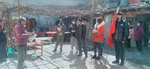 中午15点,林芝市朗县的扎西旺堆(2019畜牧(西藏)二班)举着旗子,和志愿小伙伴们走在乡间的小道上,下午要把这一片小区居民的防疫资料发完。可是第一户的扎西曲培老两口就让志愿者们费了不少劲,两个78岁的老人耳背,又不识字。扎西旺堆用手一点点指着防疫手册上的内容读给两个老人听,实在不明白的还要手舞足蹈地演示,一番功夫下来,羽绒衣里密密地闷了一背的汗。