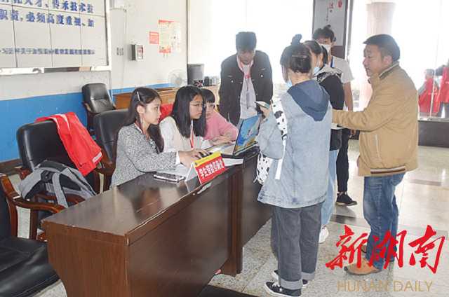 为使迎新工作顺利进行,从8日晚上开始,娄底职院全体迎新人员已经各就各位,招生、学工、后勤等部门的工作则早从暑期录取时便已开始。在9日-10日报到期间,娄底职院在主教学楼、医学院科教群楼设集中迎新报到点,高铁站、火车站、汽车站设立新生接待点,报到现场各二级学院还安排了班级辅导员及专业负责人值班,解答学生和家长提出的各种问题;学校为新生开通了生源地助学贷款的绿色通道,方便家庭经济困难的学生顺利入学,并为特别贫困家庭准备了被褥等免费用品。保卫处在校门口测量体温,在迎新现场设立多处值勤点、引导车辆进出,积极巡查,保障新生及家长的人身和财产安全,全体工作人员满腔热情地投入迎新工作,各个环节高效、畅通。