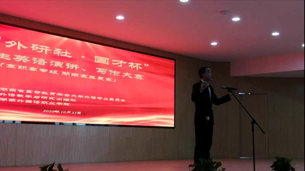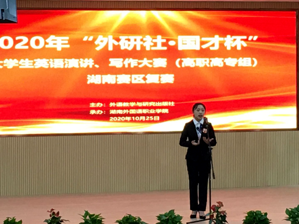 10月25日,2020“外研社·国才杯”大学生英语演讲、写作大赛(高职高专组)湖南赛区复赛在湖南外国语职业学院顺利举办。共有来自40所院校的149名选手进入本次演讲、写作大赛复赛,他们竞技语言表达、交流多元思维、探索书面沟通、弘扬时代新知,彰显了新一代大学生兼具家国情怀和全球视野的时代风采。在文化传播学院院长刘燕、教学院长肖付良的热切关心和鼎力支持及指导老师谢杰、谢花萍、龚文锋的精心指导下,我校学子取得了优异的成绩。其中谢杰老师指导的18应教3班彭梓甜同学获演讲比赛一等奖;谢花萍老师指导的18应教3班姚佳同学获二等奖;龚文锋老师指导的18商英1班甘慧芳同学获写作大赛(专业组)一等奖、委培护理1901班段嘉晖、覃雨清同学分别获写作大赛(公共组)一等奖和三等奖。