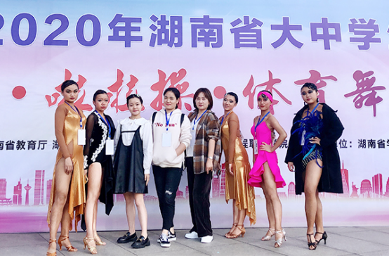 11月7日-9日,由湖南省教育厅、湖南省体育局主办的2020年湖南省大中学生健美操啦啦操体育舞蹈比赛在湖南网络工程职业学院举行。我校由副校长龙伟担任领队,李荔、何维峰、李敏芝、邱玮琳四位教练带领6位体育舞蹈队的学生参加了比赛。在高职院校甲组比赛中,经过紧张激烈的角逐,我校选手捷报频传,获得3金4银。其中,胡婷获得女子单人牛仔第一名;郑雪获得女子单人恰恰第一名;王佳琳获得女子单人斗牛第一名;郑雪获得女子单人斗牛第二名;罗卉南获得女子单人伦巴第二名、单人桑巴第二名;胡婷获得女子单人恰恰第二名;曾新颖获得女子单人牛仔第五名;彭幸获得女子单人桑巴第六名。