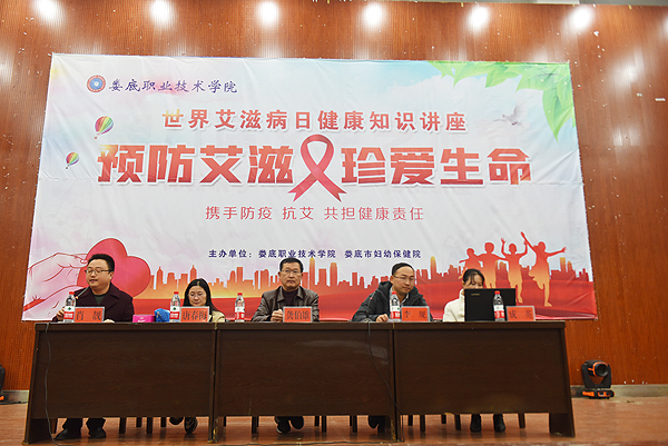 为增强我校学生艾滋病防治意识,12月2日,我校与娄底市妇幼保健院联合开展的“预防艾滋,珍爱生命”专题讲座在学术报告厅举行。娄底市妇幼保健院副院长龚伯雄,我校学生工作处处长李规、副处长肖靓,娄底市妇幼保健院健康教育科主任唐春梅出席本次讲座。由娄底市妇幼保健院产后保健科主任、妇产科副主任医师成英主讲。各二级学院学生代表聆听讲座。