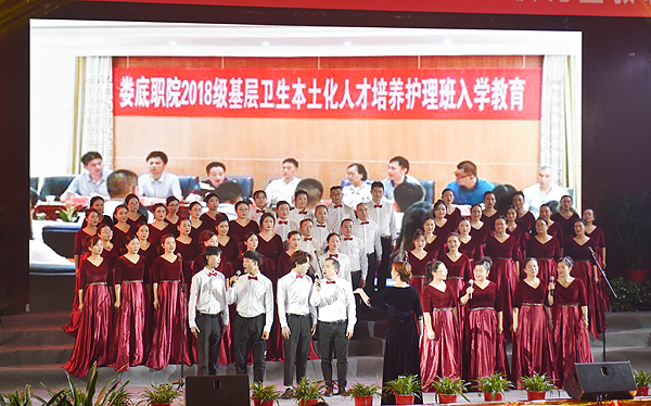 报告厅内,一首首耳熟能详,旋律优美的歌曲萦绕其中。代表队依次登台,《我的中国心》《没有共产党就没有新中国》《母亲是中华》《绣红旗》《红梅赞》《歌唱祖国》《大中国》唱出了娄职人对党、对祖国无限忠诚和挚爱;《为生命护航,共筑中国梦》《奉献》《光荣与梦想》《众人划桨开大船》《我是一个兵》《打靶归来》《我们走在大路上》《不忘初心》《年轻的朋友来相会》《明天会更好》《我们是救死扶伤的排头兵》彰显了娄职人对工作的赞美,对时代的颂扬,对未来的向往;《女人是老虎》《茉莉花》《小路》《为艺术牺牲》《龙船调》展示了教师们美妙的巧思,隽永的品味,高洁的情操。一首首合唱或激情澎湃,荡气回肠,或悠扬婉转,情真意切,伴舞、朗诵配合精美的背景视频,深深地感染着台下的观众,他们不时报以热烈的掌声。每首歌曲结束后铿锵有力的为祖国加油、为娄职鼓劲的口号声,更是震撼了整个舞台,将活动的气氛推向了高潮。