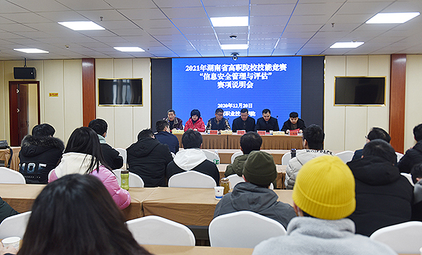 12月20日上午,2021年湖南省高职院校技能竞赛“信息安全管理与评估”赛项说明会在赛点娄底职业技术学院举行。娄底职院赛点工作组组长、益阳教科院副院长汤伏南,“信息安全管理与评估”赛项工作组负责人王丽娟,湖南省高职计算机协会副主任委员、湖南铁路职业技术学院副校长唐伟奇,神州信创集团湖南分公司总经理丁明勇,湖南永旭信息技术有限公司工程师石海赟出席,18所参赛学校领队、指导老师、参赛选手、娄底职院教务处、电子信息工程学院负责人及工作人员与会。说明会由电子信息工程学院院长刘罗仁主持。