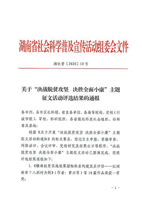 为深入贯彻落实习近平总书记关于脱贫攻坚的重要论述精神,全面展现脱贫攻坚取得的巨大成就,湖南省社科联、湖南省社科普及宣传活动组委会办公室联合在全省开展了“决战脱贫攻坚,决胜全面小康”主题征文活动,省内高校、各级社科联、党校、研究院等社会各界一起参评。全省共有10篇论文获得一等奖,我校科技处副处长刘康民的论文《基于有效阻断农村贫困群体脱贫返贫的职业教育支持研究》获得一等奖。