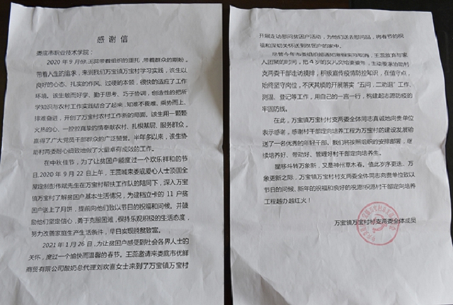 近日,娄底职业技术学院收到一封来自娄底市娄星区万宝镇万宝村村支两委的感谢信。信中写到:“(王蕊)创造性地把所学知识与农村工作实践结合起来,知难不畏难,开创了万宝村工作新的局面。用一颗火热的心、一腔真挚的热情奉献农村、扎根基层、服务群众,赢得了广大党员干部群众的广泛赞誉。”