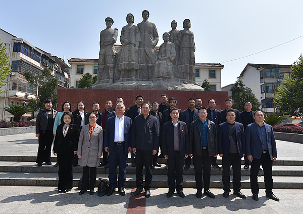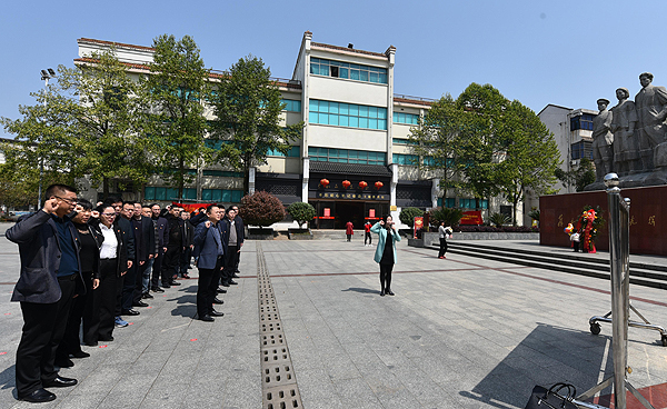 党课结束后,与会人员乘车前往双峰蔡和森纪念馆。大家首先在蔡和森纪念广场向“蔡和森同志光辉一家”群雕敬献花篮,重温了入党誓词。随后又来到蔡和森纪念馆参观,在馆长尹晓奔的介绍下,现场接受党史教育,学习蔡和森同志的丰功伟绩,体悟他的思想,汲取前进力量。